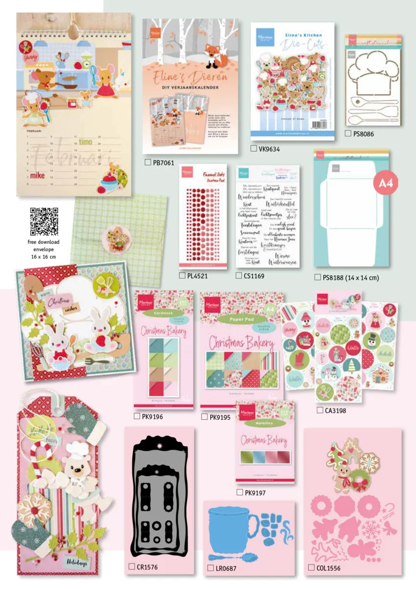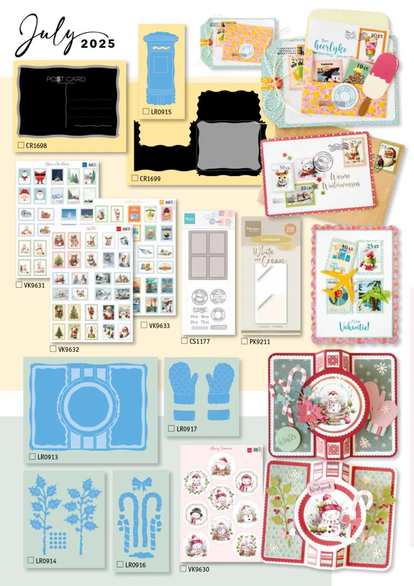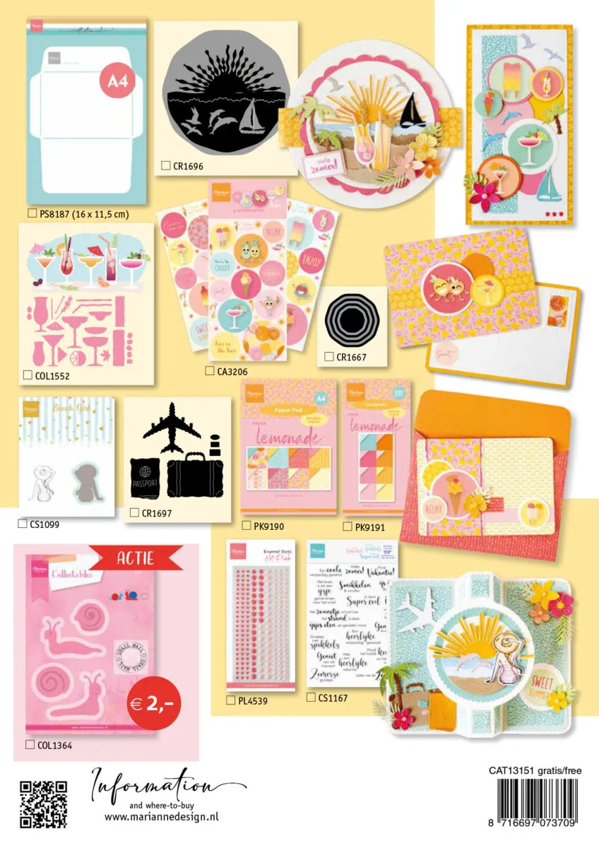 A4-Broschüre/Flyer mit einem Überblick über die neue Kollektion Nr. 151 von Marianne Design. Sommerurlaub – Weihnachtspost – Bäckerei. Juli 2025
