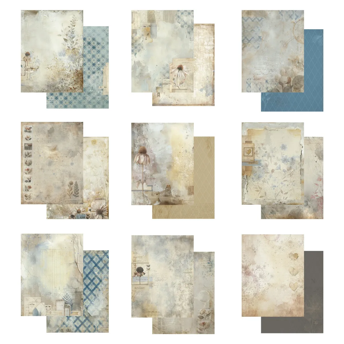 Das Faded Memory Lane 15,2 cm x 20,3 cm Pack fängt die gleiche melancholische Schönheit wie die größere Kollektion ein und besticht durch eine sanfte Palette aus staubigem Blau, warmem Sepia und gedämpftem Creme. Diese Seiten sind gefüllt mit zarten botanischen Skizzen, verwitterten Texturen und geisterhaften Schriftzügen, die eine sofortige Vintage-Basis für deine Kreativität bieten.
