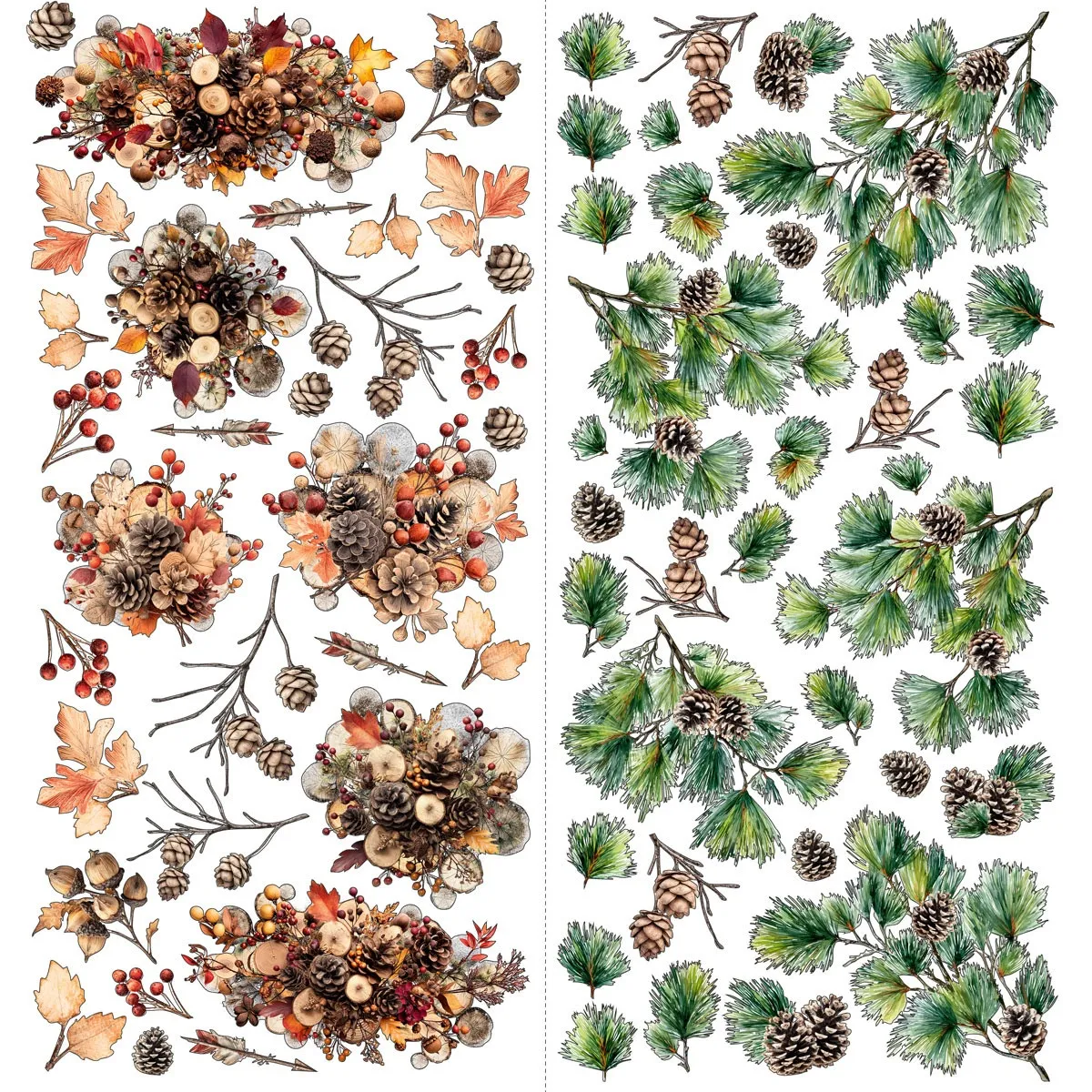 Waldflora: Filigrane Tannenzapfen-Bündel, strukturierte Zweige und eine Vielzahl realistischer Blätter, die das Gefühl eines frischen Herbsttages einfangen.