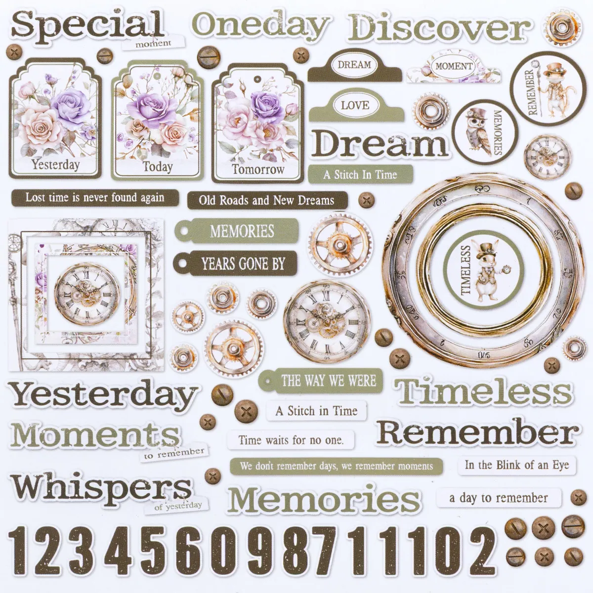 Jede Packung enthält eine Auswahl fein geschnittener Formen wie klassische Uhren, markante Zahlen, vielseitige Anhänger, dekorative Nieten sowie inspirierende Wörter und Sprüche. Die Teile lassen sich leicht verarbeiten – du kannst sie schichten, einfärben, bemalen oder prägen, um sie deinem ganz eigenen Stil anzupassen.