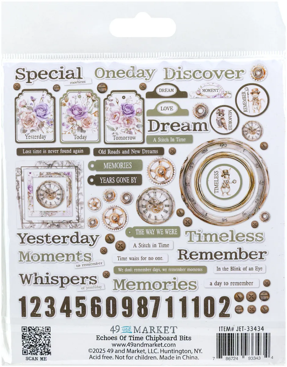 Verleihe deinen Projekten einen Hauch von Vintage mit den Echoes of Time Die-Cut Chipboard Bits. Diese Sammlung robuster, hochwertiger Chipboard-Teile bietet eine Vielzahl an Designs, die perfekt geeignet sind, um deinen Scrapbooks, Journals und Mixed-Media-Kunstwerken einen nostalgischen Touch zu verleihen.