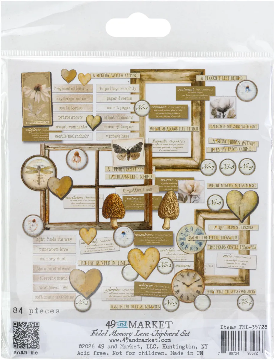 Das Faded Memory Lane Chipboard-Set ist so gestaltet, dass es wie eine kuratierte Sammlung antiker Artefakte wirkt. Es besticht durch die für die Kollektion typische, gedämpfte Palette aus warmem Ocker, Sepia und staubigem Blau. Jedes Teil ist aus dickem, hochwertigem Graupappekarton (Chipboard) gefertigt, um sicherzustellen, dass deine Projekte dauerhafte Tiefe und Stabilität erhalten.