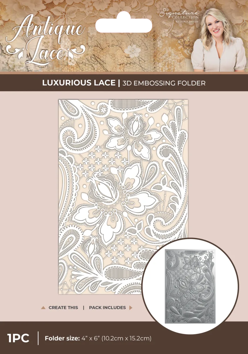 Verziere handgefertigte Karten, Event-Papeterie und Dekorationen mit der zeitlosen Schönheit des Lace Panel 15,2 cm x 10,2 cm 3D-Prägefolders aus der Sara Signature Antique Lace Kollektion. Erstelle ein erhabenes, dimensionales Muster aus filigraner Vintage-Spitze – der perfekte Hintergrund für handgefertigte Hochzeitseinladungen, Glückwunschkarten und Tischdekorationen. Füge mit Stempelkissen Farbe für zusätzliche Tiefe hinzu oder stanze Abschnitte aus, um einen raffinierten dekorativen Aufleger zu kreieren.