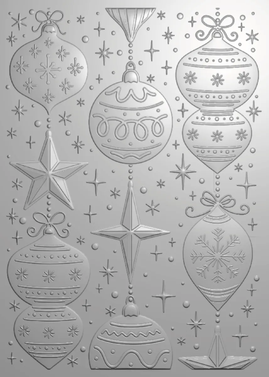 Enthält einen Prägefolder mit Christbaumkugeln in verschiedenen Formen und Größen, mit detaillierten Designs und Glitzereffekten