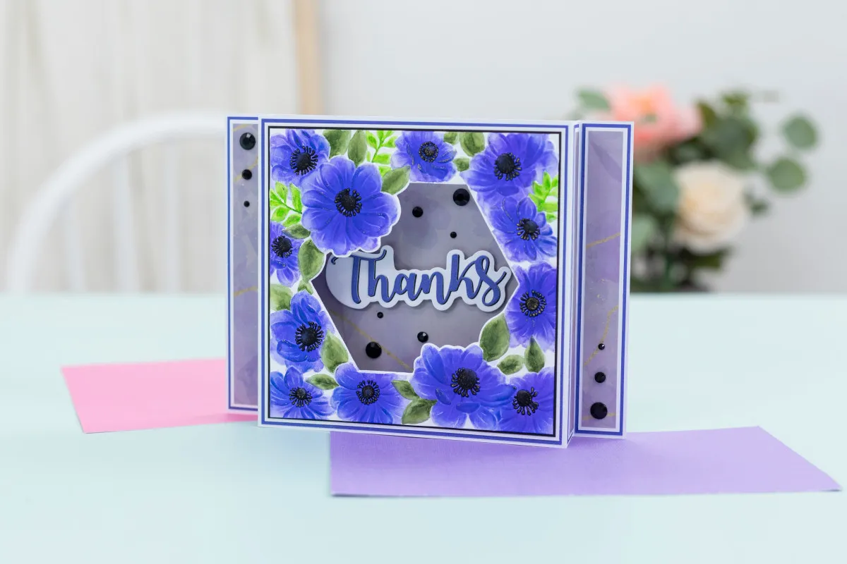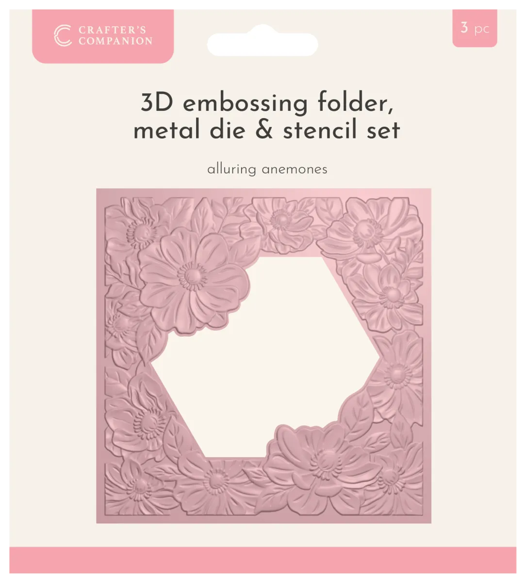 Gestalte romantische Bastelprojekte mit dem Alluring Anemones 3D-Prägefolder-, Stanzschablonen- und Stencil-Set von Crafter's Companion. Dieses Set enthält einen Prägefolder, eine Schablone und eine Metallstanze, mit denen du einen wunderschönen Rahmen in Sechseckform gestalten kannst – umgeben von Anemonen – perfekt für handgemachte Grußkarten.