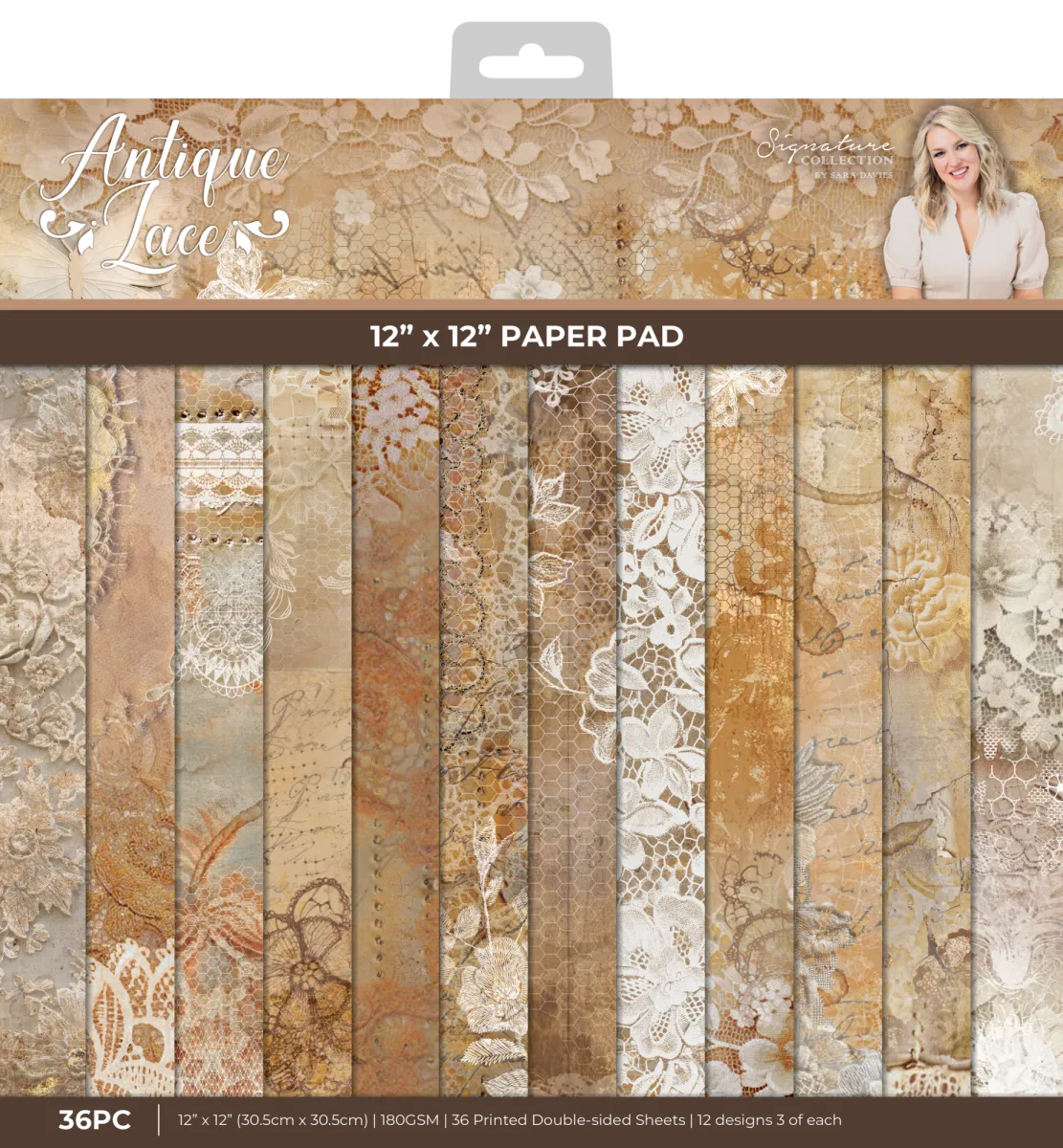Der Sara Signature Antique Lace 30,5 cm x 30,5 cm Papierblock strahlt eine dezente Eleganz sowie Wärme aus und schafft den perfekten Rahmen für Anlässe, die in Erinnerung bleiben. Als Teil der Sara Signature Antique Lace Kollektion enthält dieser Block 36 Blatt gemustertes Papier im Format 30,5 cm x 30,5 cm. Es stehen 12 doppelseitige Designs zur Auswahl, die komplizierte und zarte Spitzenmuster vor warmen, rustikalen Tönen und Vintage-Effekten im Distressed-Stil zeigen. Da jedes Design dreimal enthalten ist, gibt es mehr als genug Material, um den perfekten Hintergrund für Hochzeitseinladungen, Scrapbook-Seiten, Geschenkverpackungen und vieles mehr zu gestalten.