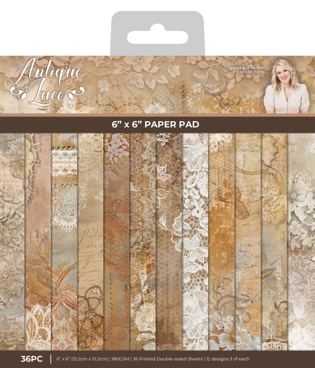 Zarte Spitze und warme, rustikale Töne vereinen sich im Sara Signature Antique Lace 15,2 cm x 15,2 cm Papierblock zu einer stimmungsvollen Romantik. Als Teil der Sara Signature Antique Lace Kollektion enthält dieser Block 36 gemusterte Blätter, jedes in der Größe 15,2 cm x 15,2 cm. Wähle aus 12 doppelseitigen Designs, von denen jedes ein anderes, filigranes Spitzendesign aufweist – perfekt für Hochzeiten und romantische Anlässe. Da jedes Design dreimal enthalten ist, hast du genug Auswahl, um selbstgemachter Event-Papeterie, Hochzeitseinladungen, Tischdekorationen und vielem mehr ein warmes, zeitloses Vintage-Gefühl zu verleihen.
