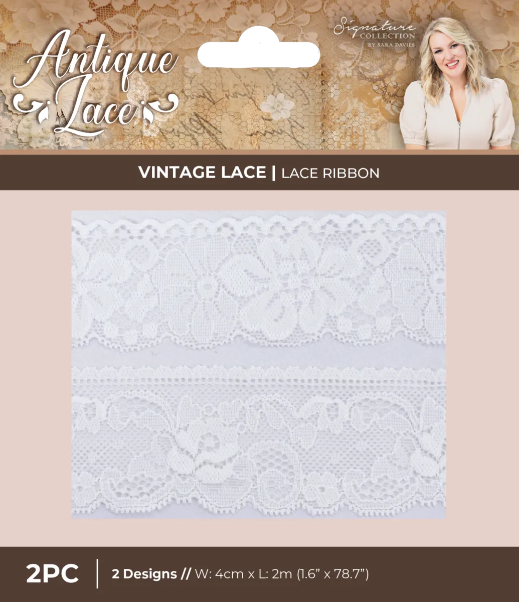 Veredle deine Karten und Geschenke mit authentisch schönen Verzierungen aus dem Vintage Lace Pack der Sara Signature Antique Lace Kollektion. Dieses Set enthält zwei Stücke echtes Spitzenband, die jeweils eine Breite von 4,0 cm und eine Länge von 2,0 Metern haben. Wähle aus den zwei filigranen und weichen Designs, um Geschenke zu verpacken, Karten sowie Event-Dekorationen zu verschönern oder um Hochzeitseinladungen mit einer anspruchsvollen Banderole zu versehen.