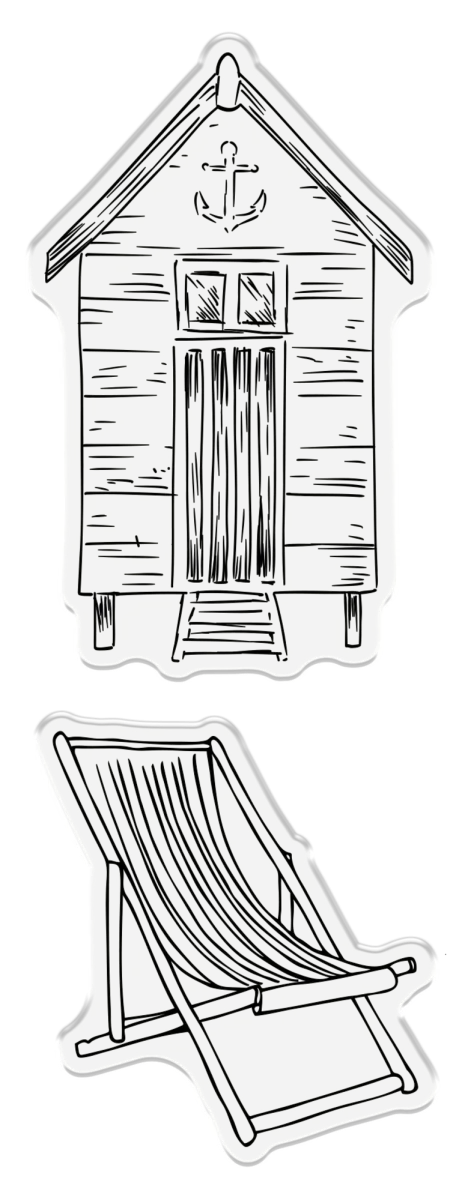 Enthält zwei Metallstanzen und zwei Stempel mit einem Strandhäuschen und einem Strandstuhl.
