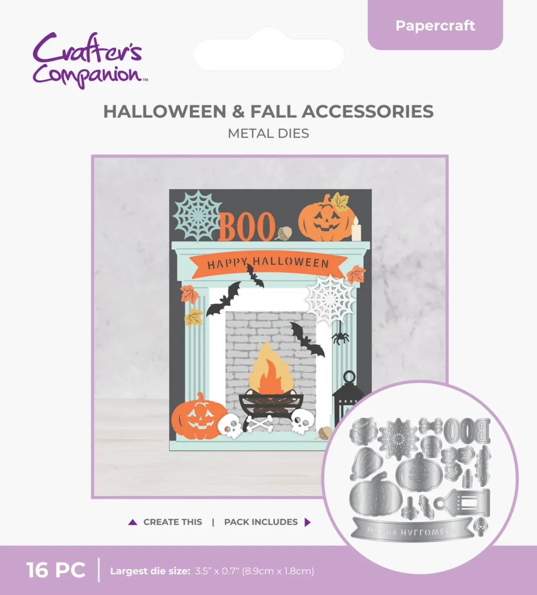 Verleihe deinen Projekten herbstliche Wärme oder einen gruseligen Touch mit dem Halloween & Autumn Accessories Stempel- und Stanzschablonen-Set von Crafter's Companion.