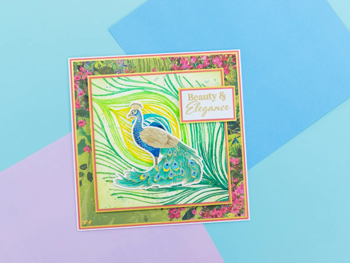 Lass deine Bastelprojekte so eindrucksvoll wirken wie ein Pfau mit dem Proud Peacock Stempel- & Stanzenset aus der Graceful Plumes Kollektion von Crafter's Companion.
