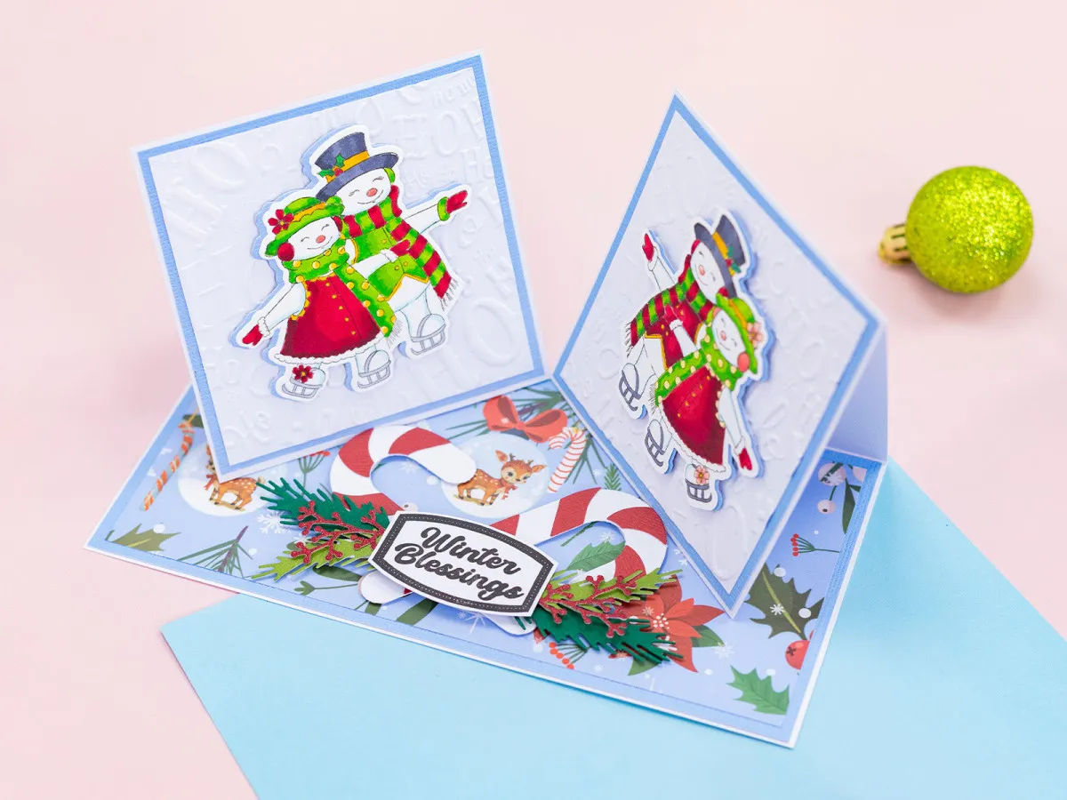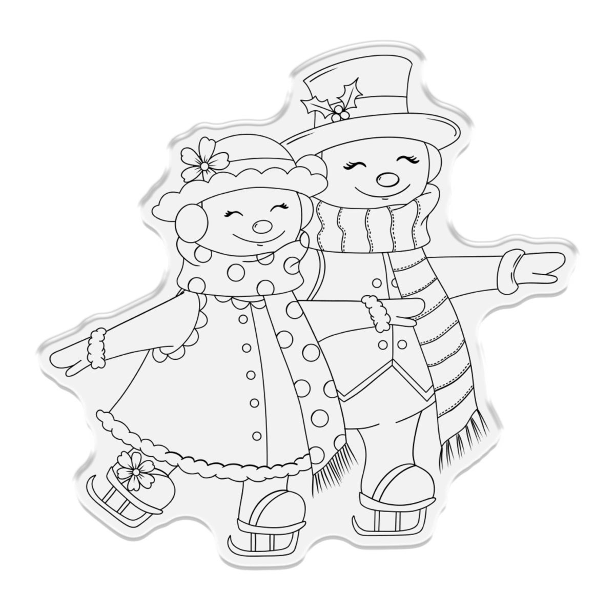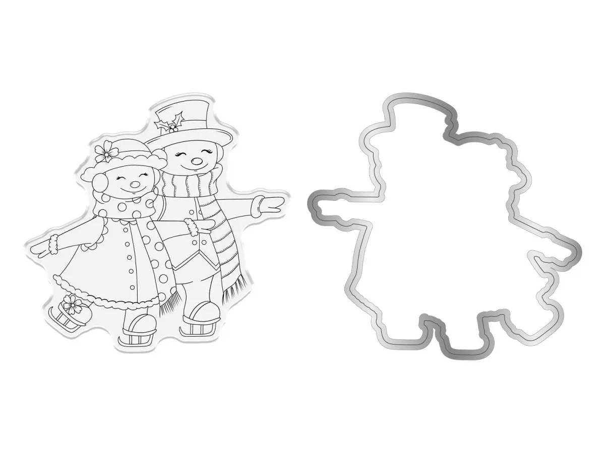 Das 2-teilige Set enthält einen Stempel und eine Metallstanzform von zwei warm eingepackten Personen beim Eislaufen.