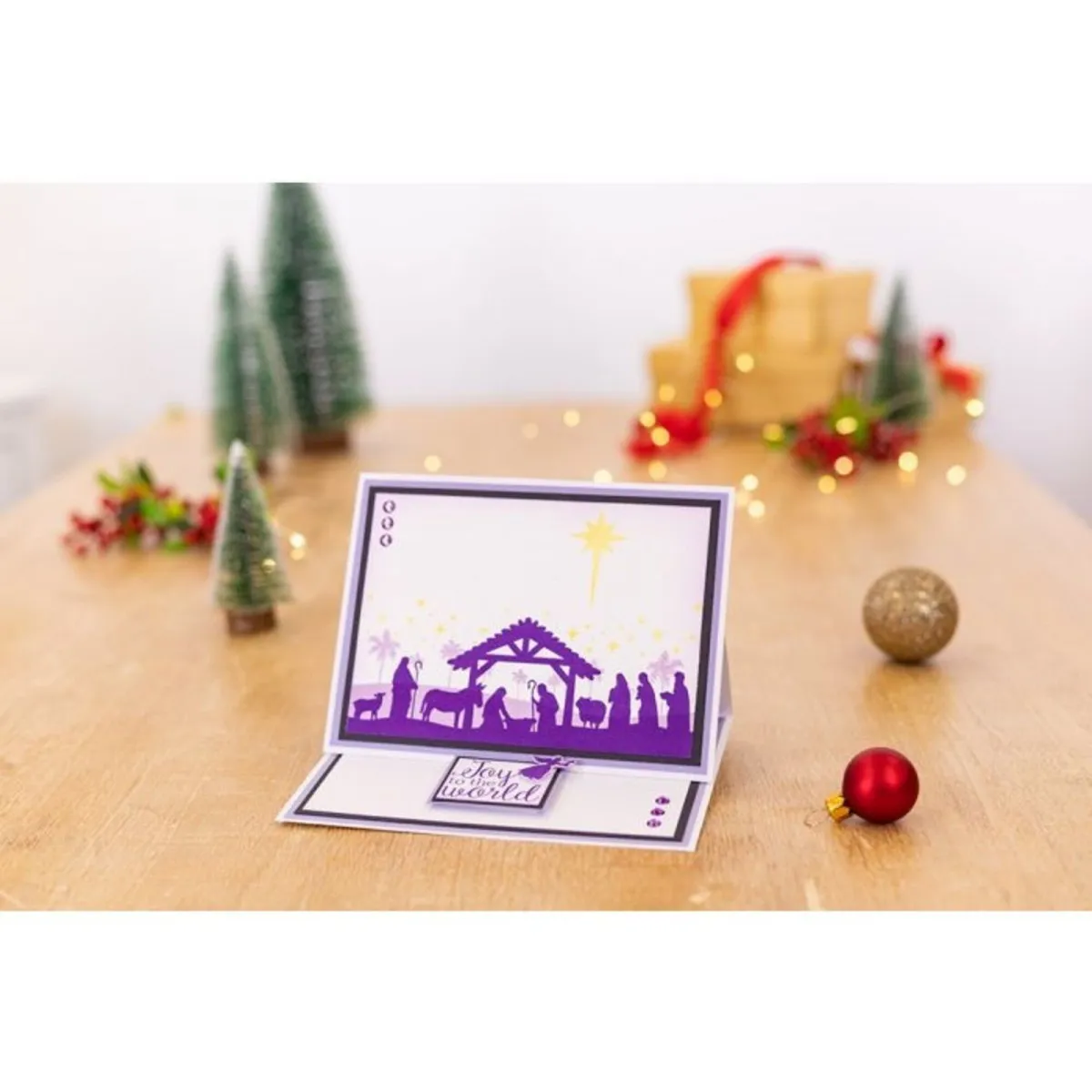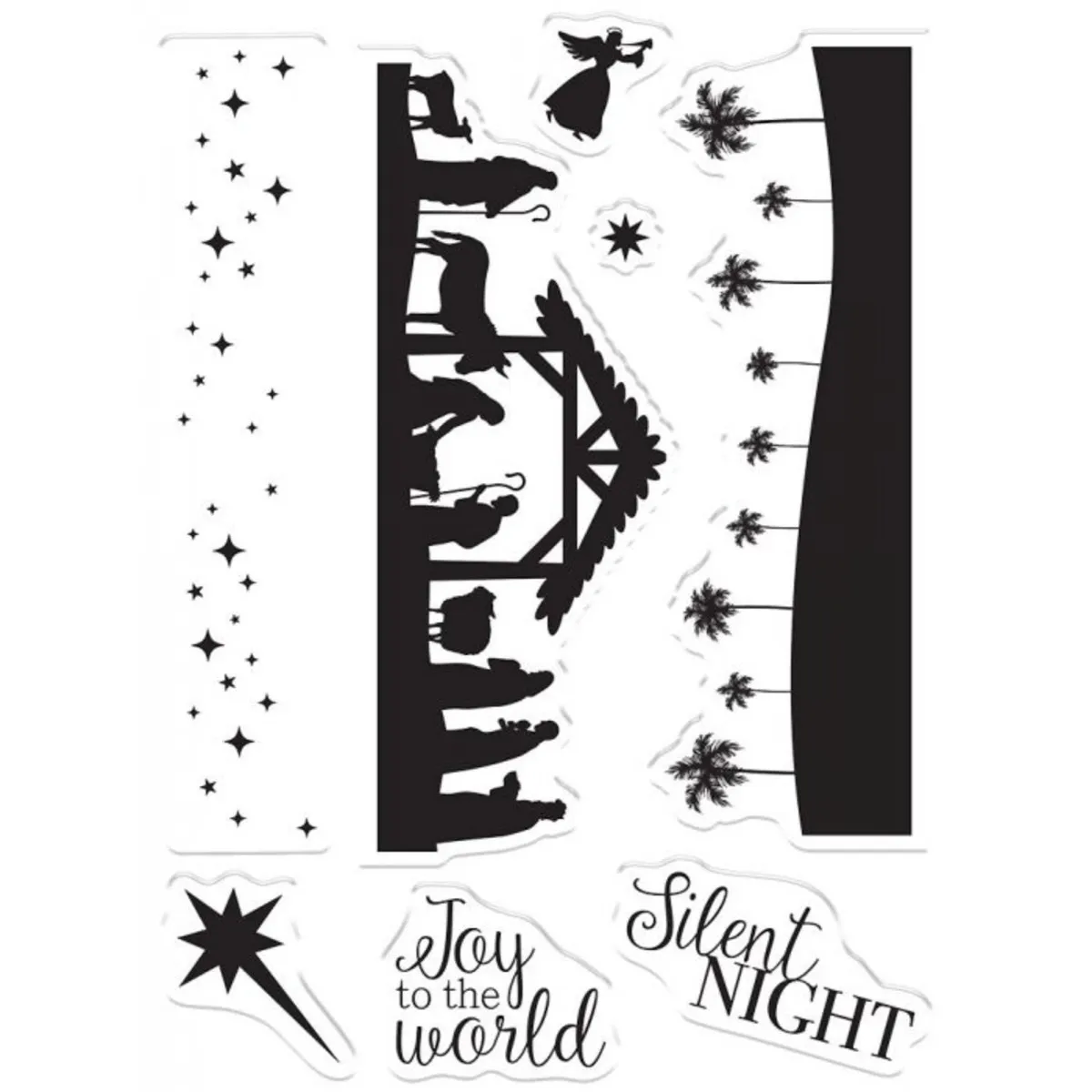 Das Christmas Nativity Set enthält 9 Stempel, mit denen du ein geschichtetes Motiv erstellen kannst. Es zeigt eine klassische Krippenszene vor einem Palmenhintergrund, überragt von einem sternenklaren Himmel. Mit Stern- und Engelverzierungen sowie Sprüchen wie „Joy to the World“ und „Silent Night“ hast du alles, was du für eine wunderschöne, traditionelle Karte brauchst!