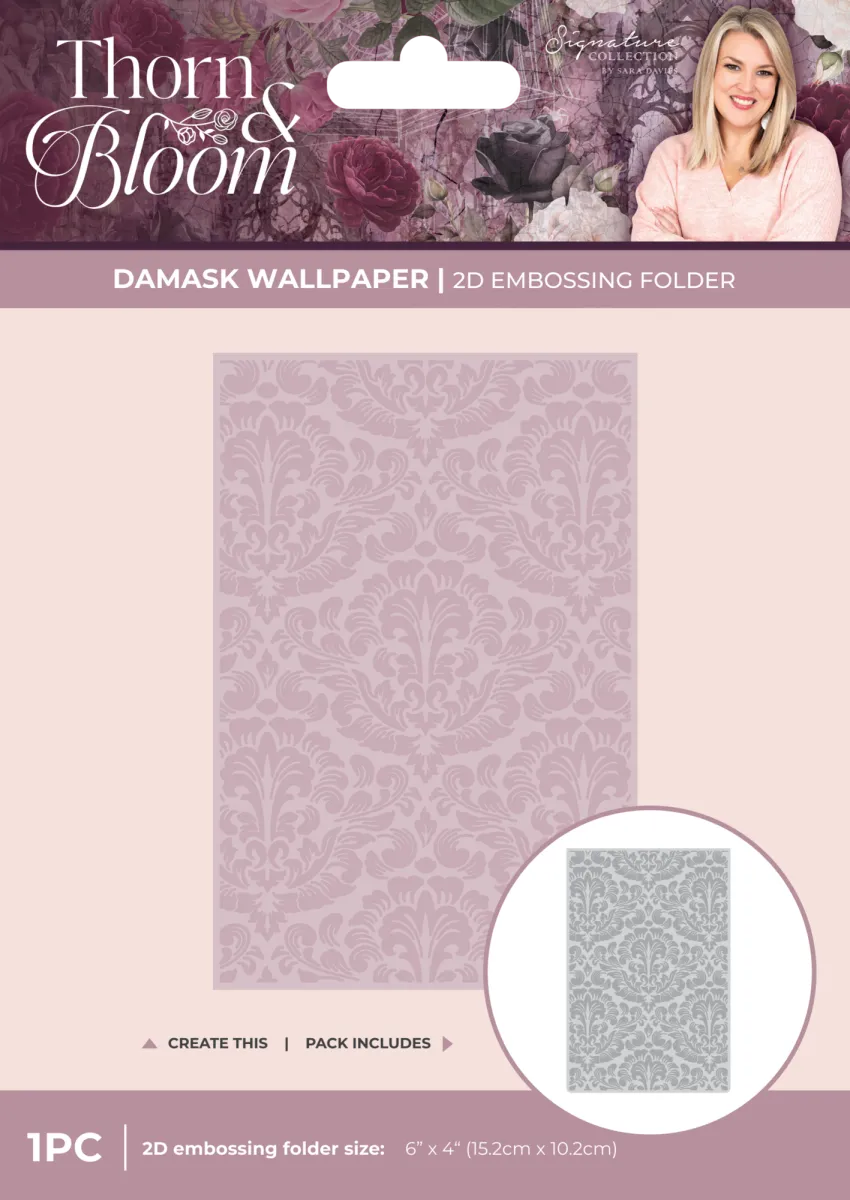 Enthält einen 2D-Prägefolder mit Damast-Tapetenmotiv. Größe des Folders: 15,2 cm x 10,2 cm. Kompatibel mit den Stanze- und Prägemaschinen Mini, Midi, Junior und Gemini II. Teil der Sara Signature Thorn & Bloom Kollektion von Crafter's Companion.