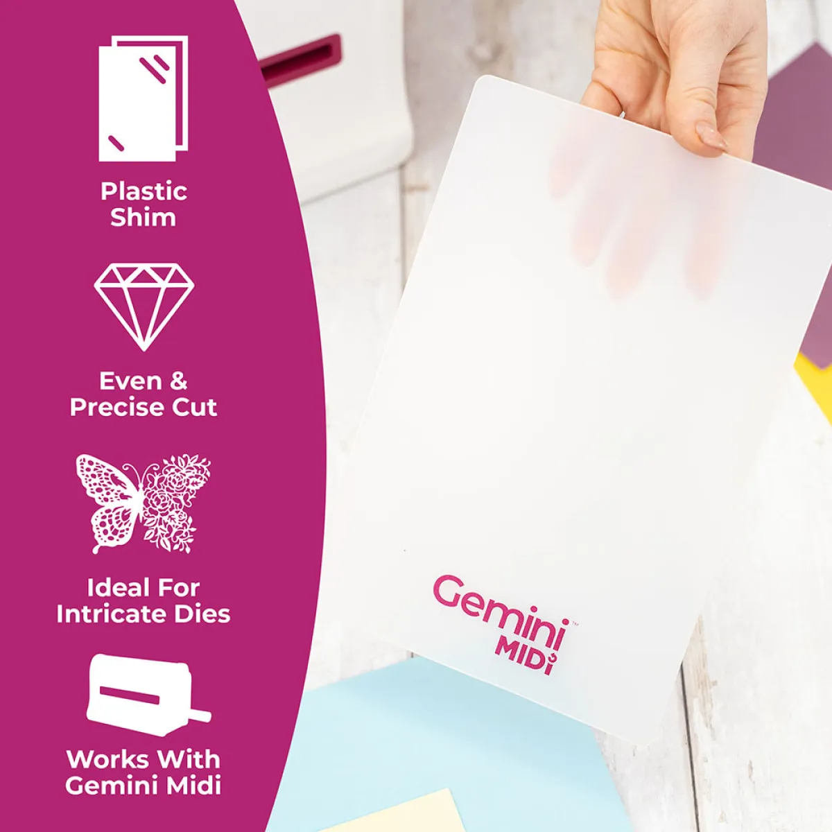 Lege einfach die Gemini Midi Kunststoff-Unterlage zwischen deinen Gemini Midi Kunststoff-Ordner und führe das Material wie gewohnt durch die Maschine.