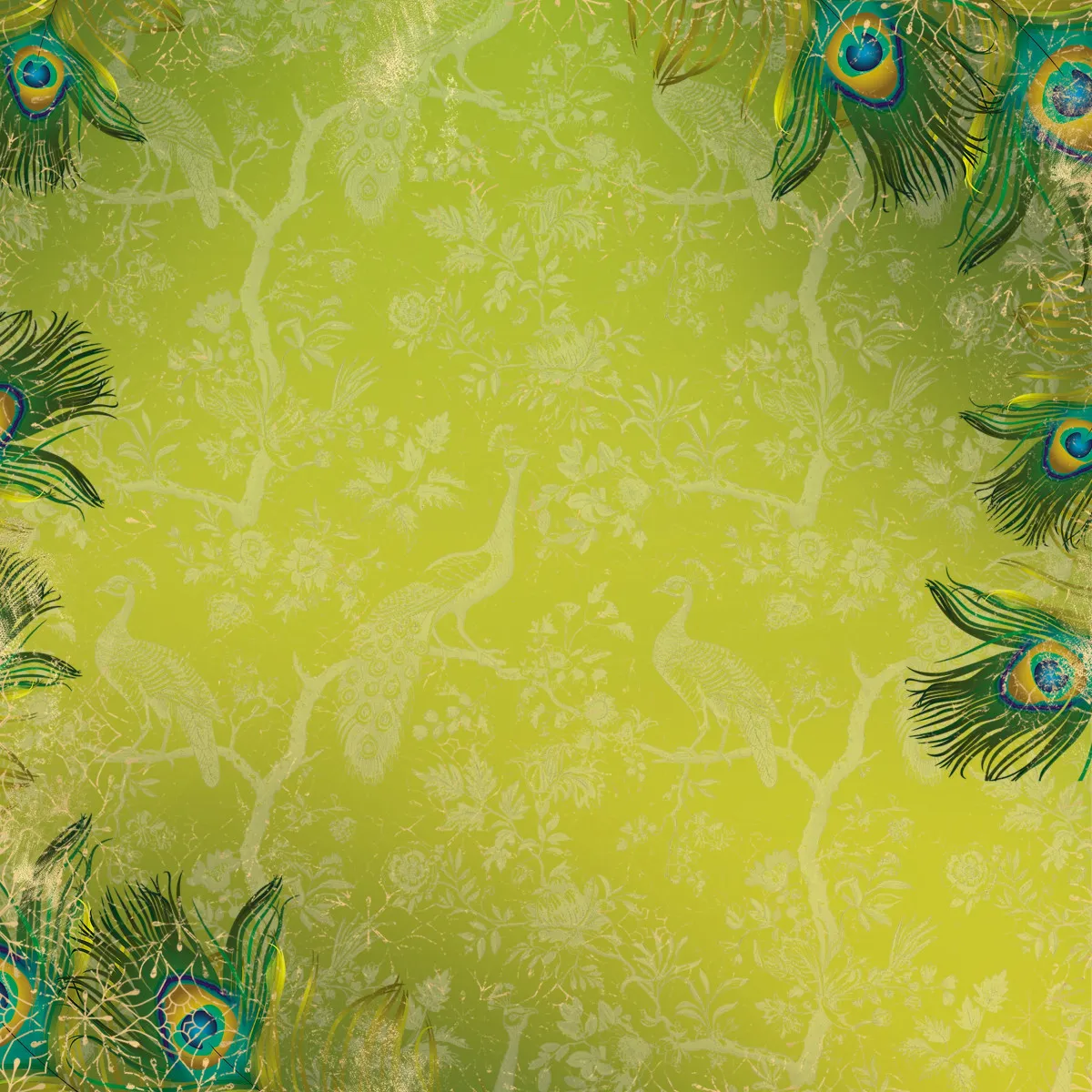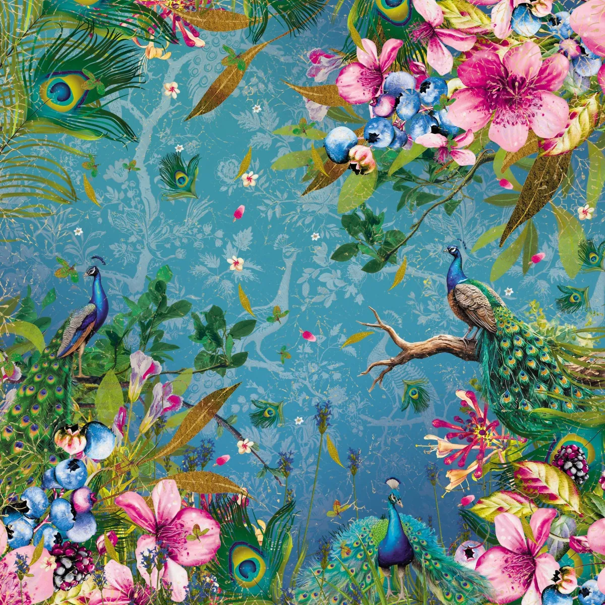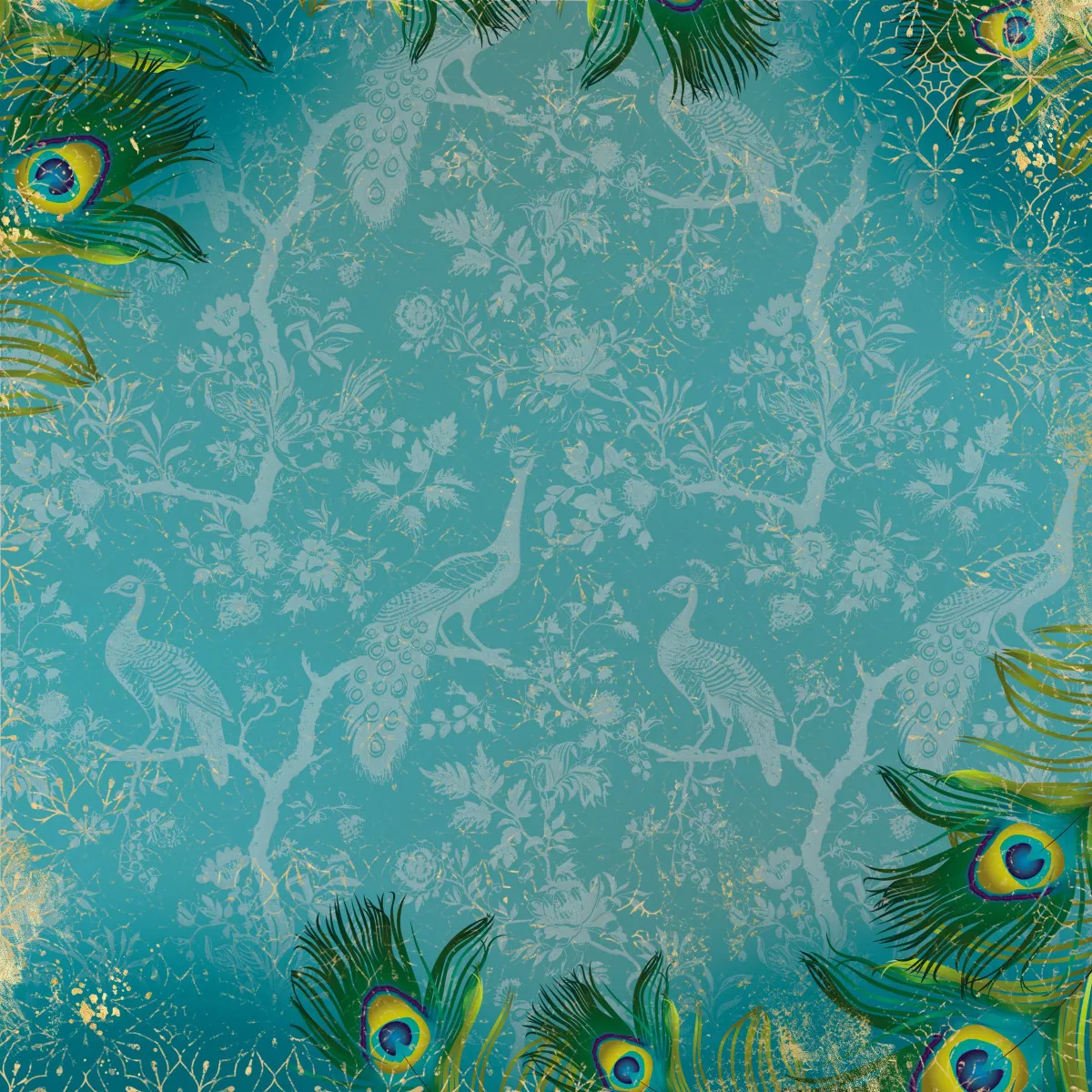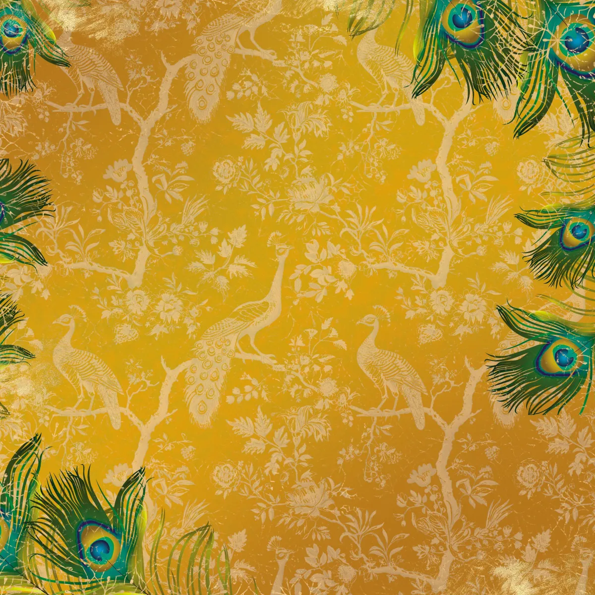 Jeder Block enthält 36 Blatt mit 12 atemberaubenden, farbenfrohen Designs, geschmückt mit Pfauen und floralen Motiven auf leuchtenden, warmen Hintergründen.