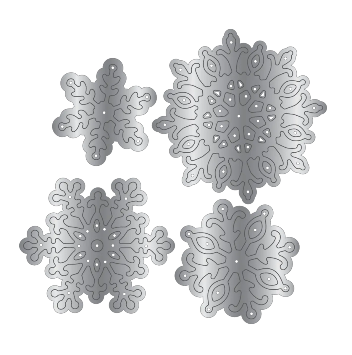 Enthält vier Metall-Stanzformen mit filigranen Schneeflocken in verschiedenen Größen und Formen.