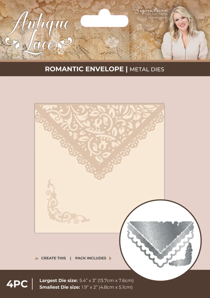 Gestalte Hochzeitseinladungen und Event-Papeterie zum Aufbewahren mit dem Romantic Envelope Metallstanzformen-Set, das Teil der Sara Signature Antique Lace Kollektion ist.