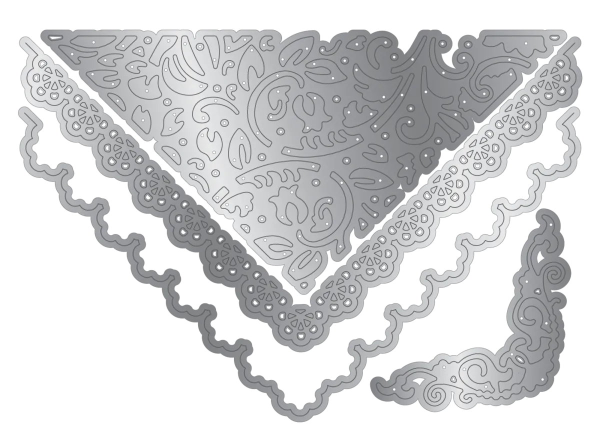 In diesem Set erhältst du vier Metallstanzformen. Zwei größere Stanzformen sind so konzipiert, dass sie ein verschnörkeltes und filigranes Muster in eine Umschlagklappe schneiden. Eine kleinere Stanzform lädt dich dazu ein, nur das Ende der Umschlagklappe zu verzieren, und eine Eckstanzform sorgt für einen dekorativen Abschluss – oder einen Rahmen für die Adresse. Die größeren Stanzformen können auch verwendet werden, um eine von Spitze inspirierte Gatefold-Karte zu erstellen. Kombiniere und gestalte ganz nach deinen Wünschen, um deine Hochzeits- und Eventeinladungen sowie deine Papeterie aufzuwerten.