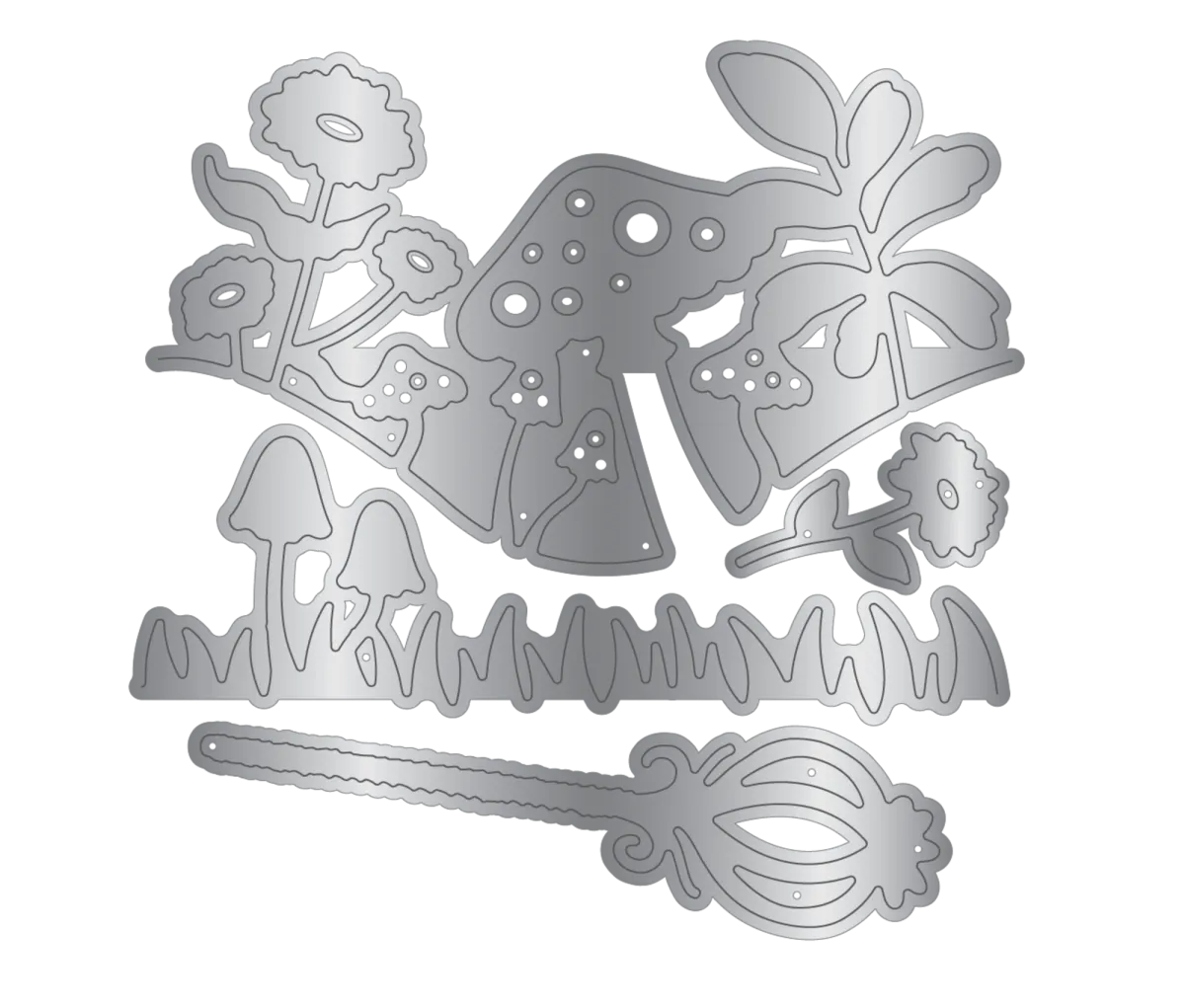 Dieses 4-teilige Metallschablonen-Set erschafft ein detailreiches, blumiges Feengarten-Motiv.