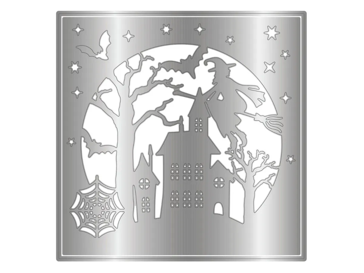 2-teiliges Metallschablonen-Set zur Gestaltung einer Haunted-House-Silhouette mit Fledermäusen, Sternen, Bäumen und einer Hexe auf dem Besen