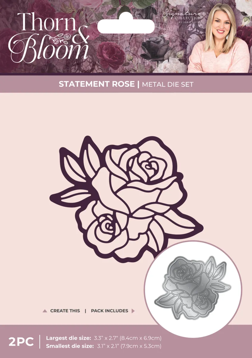 2-teiliges Metallstanzen-Set zur Erstellung einer voll erblühten Rose. Größe der Stanze: 8,4 cm x 11,7 cm. Kompatibel mit den Stanze- und Prägemaschinen Mini, Midi, Junior und Gemini II. Teil der Sara Signature Thorn & Bloom Kollektion von Crafter's Companion.
