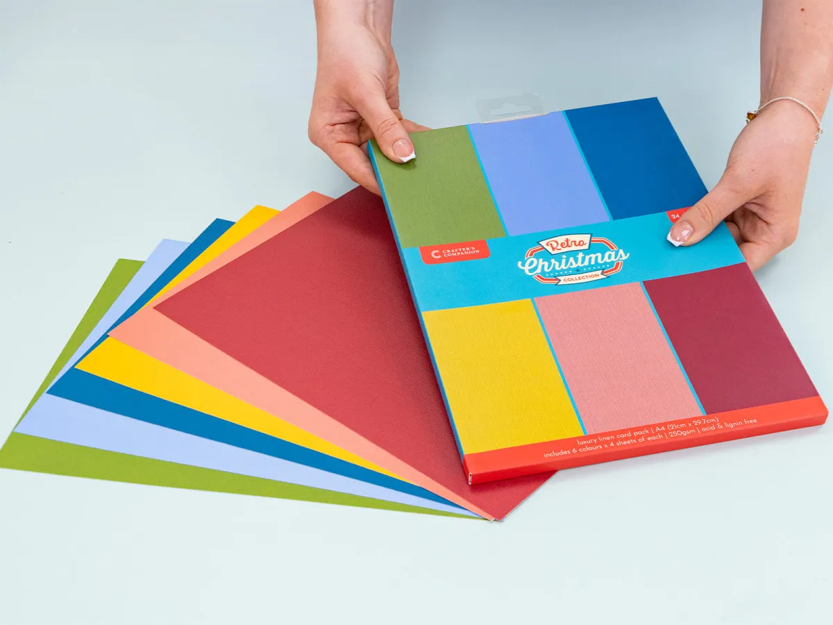 Die A4 Luxury Linen Card aus der Retro Christmas Kollektion von Crafter's Companion enthält sechs Farben. Mit ihrer weichen Leinenstruktur ist sie perfekt geeignet, um deinen Karten und Bastelprojekten eine dimensionale, natürliche Textur zu verleihen. Dieser Premium-Karton kann für Scrapbook-Seiten, Geschenkboxen, Taschen und Partydekoration verwendet werden.