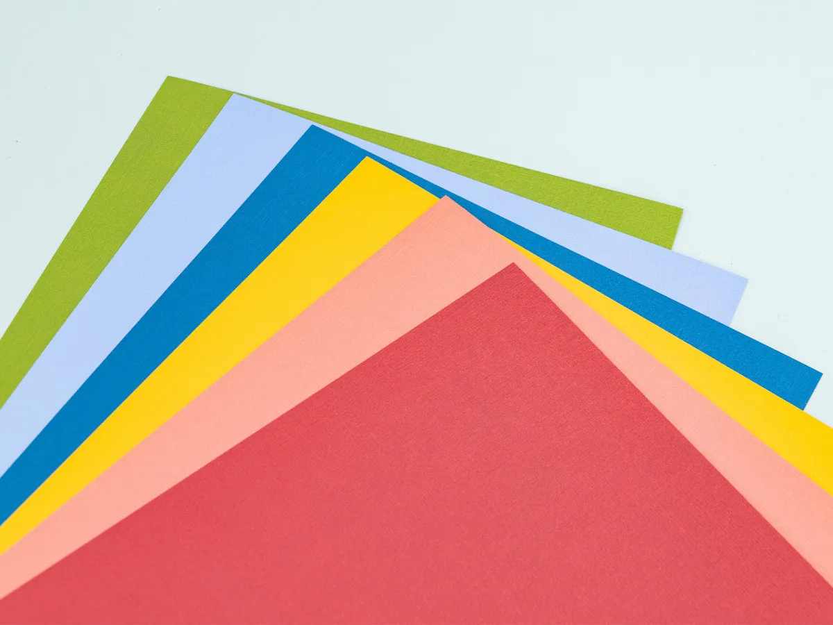 Enthalten sind 24 Bögen doppelseitiger Leinenkarton. Die Farben – Dunkelblau, Hellblau, Grün, Gelb, Pink und Rot – ergänzen perfekt die Töne des bedruckten Papierblocks.