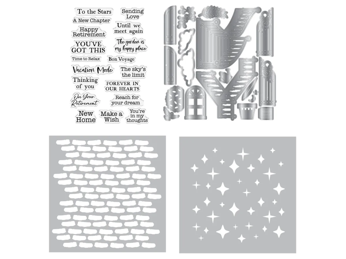 Gestalte deine Karten mit dem Staircase Scene Stamp, Die & Stencil Set von Crafter’s Companion auf besondere Weise. Dieses umfangreiche 39-teilige Set enthält 19 Metallstanzen, 2 Schablonen und 18 Textstempel, um eine klassische Treppenszene zu erstellen und zu dekorieren. Kombiniere Stile, Hintergründe und Sprüche, um stimmungsvolle und durchdachte Karten für viele Anlässe zu gestalten, von Einzug und Feiertagen bis hin zu Beileids- oder Ruhestandskarten.