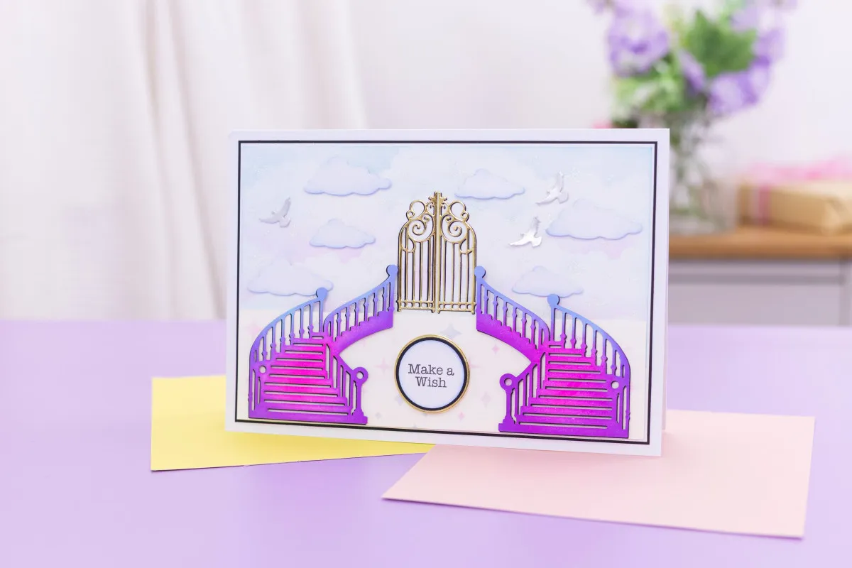 Entfalte märchenhafte Kartenideen mit der Staircase Scene Stamp, Die & Stencil Kollektion von Crafter’s Companion. Von einem Palast wie im Märchen bis hin zu einer toskanischen Villa, vom neuen Zuhause bis zu einem Platz unter den Sternen – dieses Set hebt deine handgemachten Karten auf ein neues Level. Es enthält Stempel, Stanzformen und Hintergrundschablonen, mit denen du personalisierte Szenen gestalten kannst. Wähle geschwungene Treppen, verzierte Tore, Türen und Fenster, um eine Szenerie zu erschaffen, die perfekt für Karten zum Einzug, zum Ruhestand und vieles mehr geeignet ist.