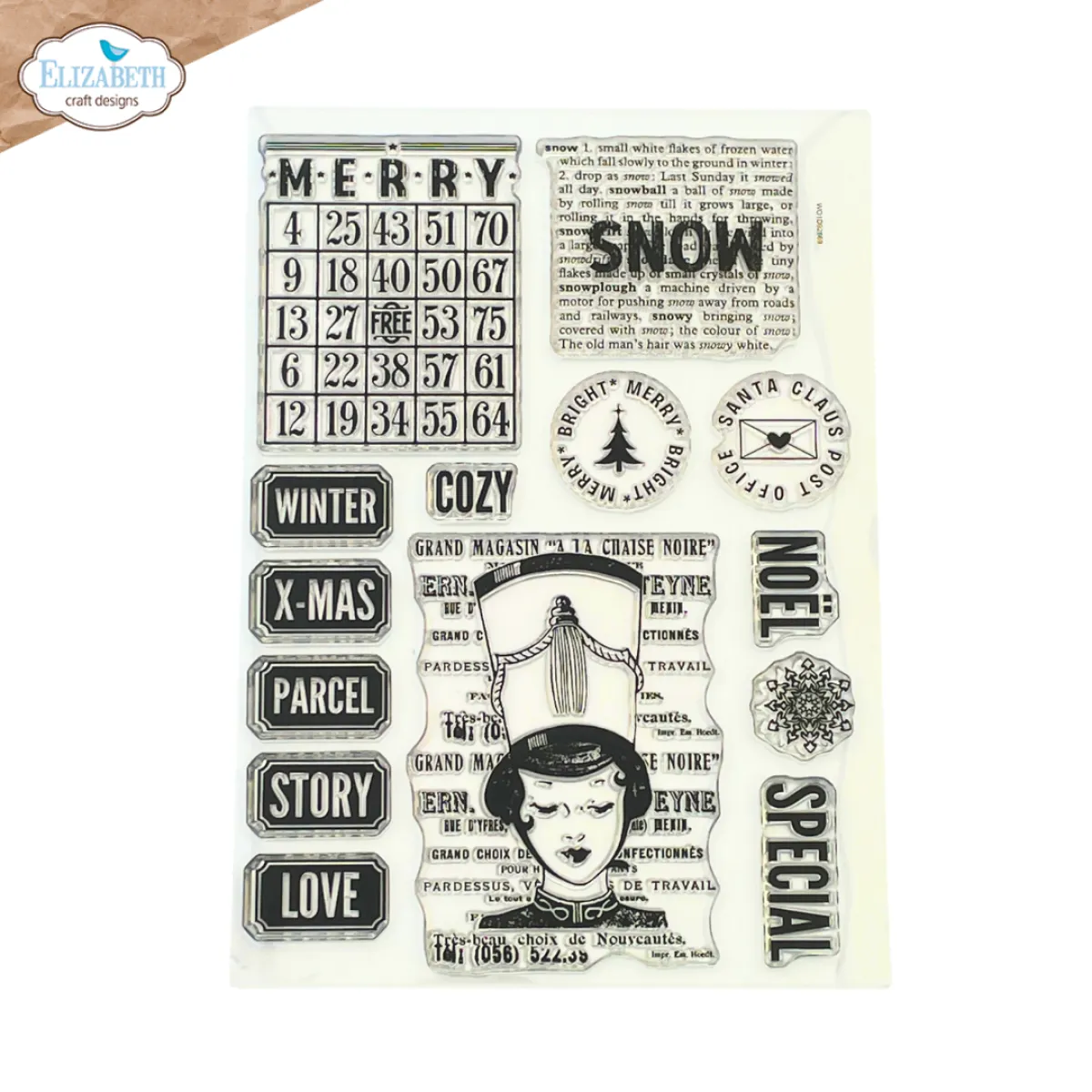 Dieses Set enthält eine Dame mit einem Vintage-Hut, eine Bingokarte und verschiedene winterliche Texte, sodass du deine Wintergeschichten ganz einfach dokumentieren kannst.