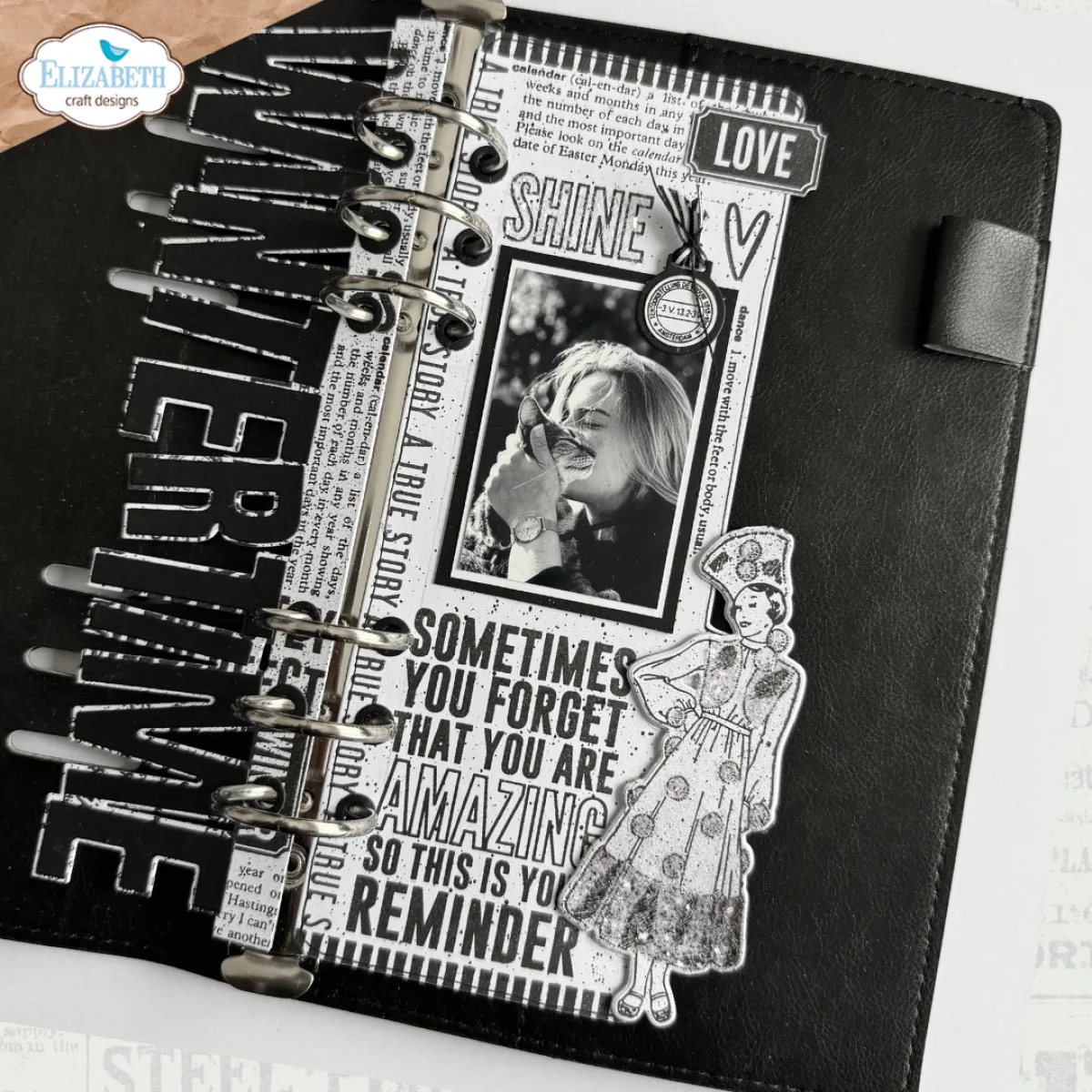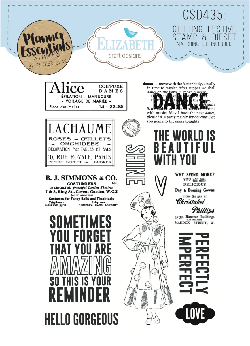 Dieses Set enthält eine Dame, festlich für Weihnachten gekleidet, zusammen mit einer passenden Stanzform und verschiedenen Sentiment-Stempeln, um deine Seiten zu vervollständigen, darunter „Die Welt ist schön mit dir“ und „Manchmal vergisst du, dass du großartig bist – dies ist deine Erinnerung daran“.