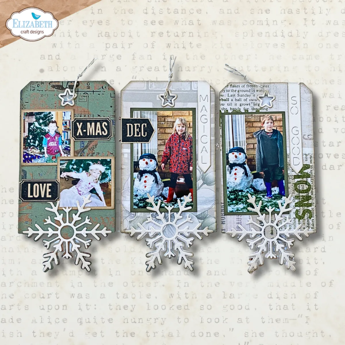 Mit diesem spaßigen Set kannst du Tags in zwei Größen mit dekorativem Schneeflockenrand erstellen und sie mit winterlichen Elementen und Bannern verzieren.