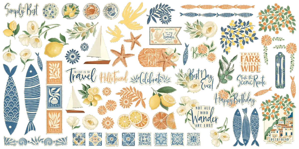 Verspielte Motive mit Zitrusfrüchten, Fischen und ornamentalen Fliesenmustern erinnern an luftige Küstenmärkte und gewundene Küstenstraßen. Scenic Route eignet sich perfekt, um Abenteuer zu dokumentieren, Urlaubs-Erinnerungen fe