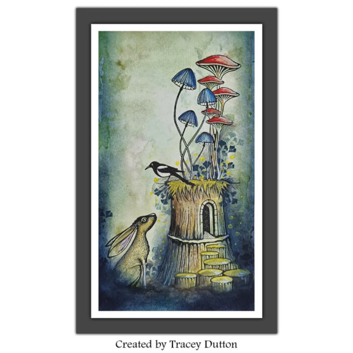 Ein einzelner Stempel, der einen kletternden Turm aus Pilzen zeigt, mit fünf Hüten in verschiedenen Größen, die aus miteinander verbundenen Stielen sprießen.