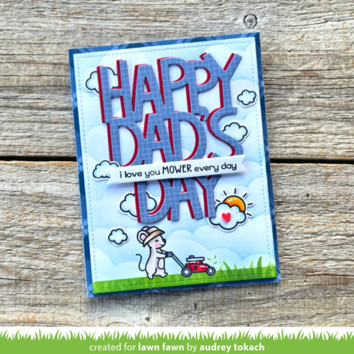 Setze ein Statement, indem du den großen Schriftzug Giant Happy Dad’s Day auf deiner Karte platzierst. Die kleinen Gärtner-Mäuse aus Apple-solutely Awesome, Veggie Happy, Veggie Happy Add-On und Garden Mouse wären eine superniedliche Ergänzung für deine Szene!