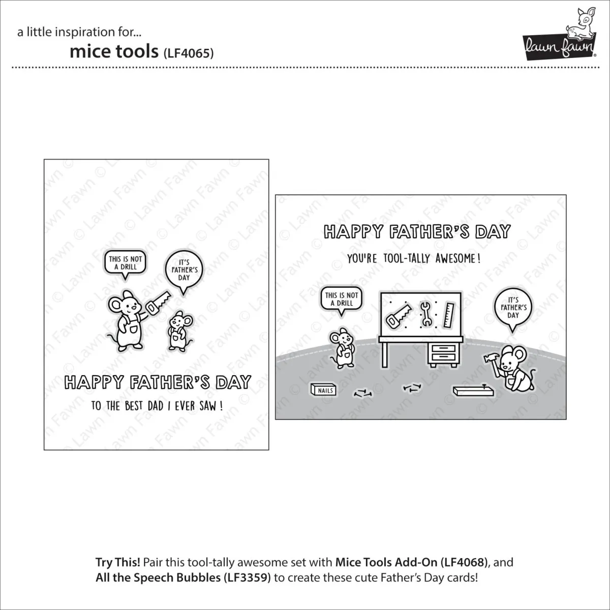 Dieses Set ist eine absolut großartige Wahl für Karten und Projekte zum Vatertag! Es enthält viele geschäftige Mäuse, ihre Werkstatt und Werkzeuge sowie eine Auswahl an super süßen (und vom Papa genehmigten) Sprüchen mit lustigen Wortspielen. Benötigst du noch mehr Details für dein Bauprojekt? Das Mice Tools Add-On bietet eine weitere Maus und tolle Sprüche zum Thema Sägen.