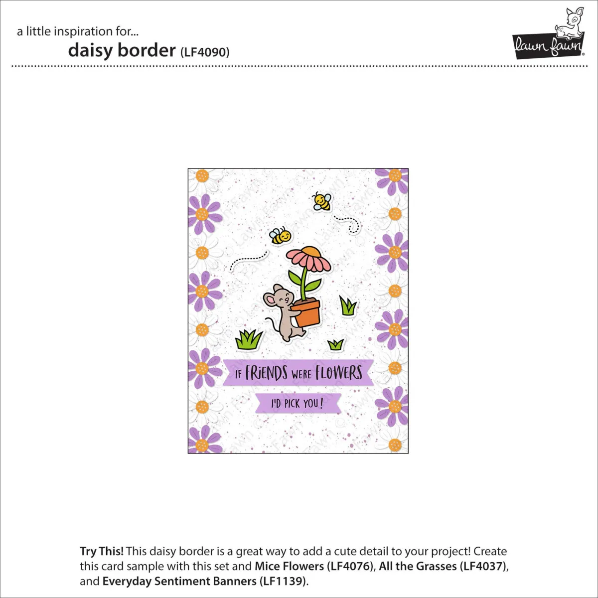 Diese Bordüre ist perfekt für Karten im Quer- oder Hochformat! Nutze die enthaltenen einzelnen Gänseblümchen-Schichten, um deiner Bordüre viel Farbe zu verleihen; klebe sie flach auf oder lasse sie mit Schaumklebeband oder Klebepads für einen tollen 3D-Effekt hervorstehen. Verwende deinen Lieblingskarton (glänzendes Papier macht besonders viel Spaß) oder gemustertes Papier für einen jedes Mal einzigartigen Look!