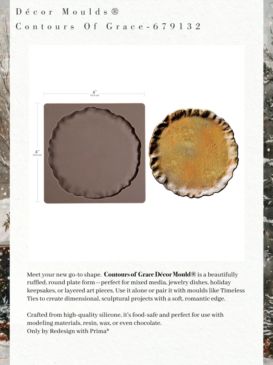 Lerne deine neue Lieblingsform kennen: Die Contours of Grace Décor Mould ist eine wunderschön geraffte, runde Tellerform – perfekt für Mixed-Media-Projekte, Schmuckschalen, festliche Erinnerungsstücke oder mehrschichtige Kunstwerke. Verwende sie allein oder kombiniere sie mit Formen wie Timeless Ties, um dimensionale, skulpturale Projekte mit einer weichen, romantischen Note zu gestalten. Gefertigt aus hochwertigem Silikon, ist sie lebensmittelsicher und ideal für die Verwendung mit Modelliermassen, Resin, Wachs oder sogar Schokolade. Nur von Redesign with Prima.