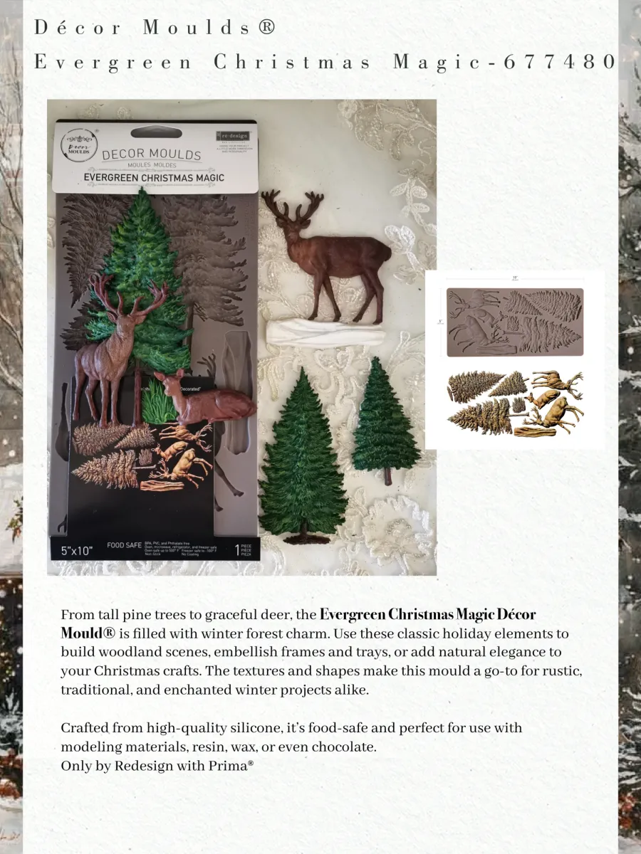 Von hohen Kiefern bis hin zu anmutigen Rehen – die Evergreen Christmas Magic Décor Mould ist voller winterlichem Waldzauber. Verwende diese klassischen Weihnachtselemente, um Waldszenen zu gestalten, Rahmen und Tabletts zu verzieren oder deinen Weihnachtsprojekten natürliche Eleganz zu verleihen. Die Texturen und Formen machen diese Form zu einem unverzichtbaren Werkzeug für rustikale, traditionelle und verzauberte Winterprojekte gleichermaßen. Gefertigt aus hochwertigem Silikon, ist sie lebensmittelsicher und perfekt für die Verwendung mit Modelliermassen, Resin, Wachs oder sogar Schokolade. Nur von Redesign with Prima.