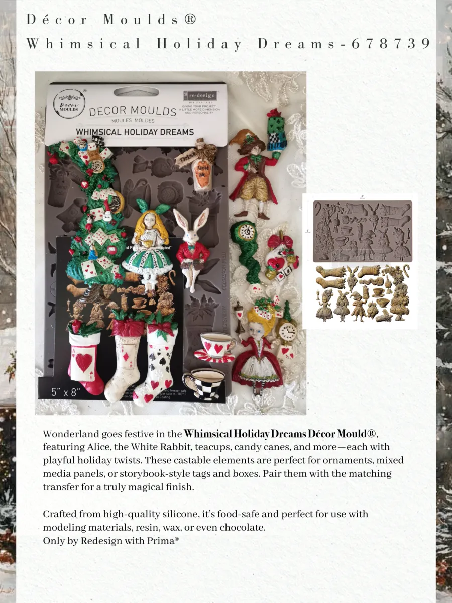 Das Wunderland wird festlich mit der Whimsical Holiday Dreams Décor Mould, die Alice, den weißen Hasen, Teetassen, Zuckerstangen und mehr enthält – jedes Element mit verspielten weihnachtlichen Details. Diese gießbaren Elemente sind perfekt für Ornamente, Mixed-Media-Paneele oder märchenhafte Anhänger und Schachteln. Kombiniere sie mit dem passenden Transfer für ein wirklich magisches Ergebnis. Gefertigt aus hochwertigem Silikon, ist sie lebensmittelsicher und perfekt für die Verwendung mit Modelliermassen, Resin, Wachs oder sogar Schokolade. Nur von Redesign with Prima.