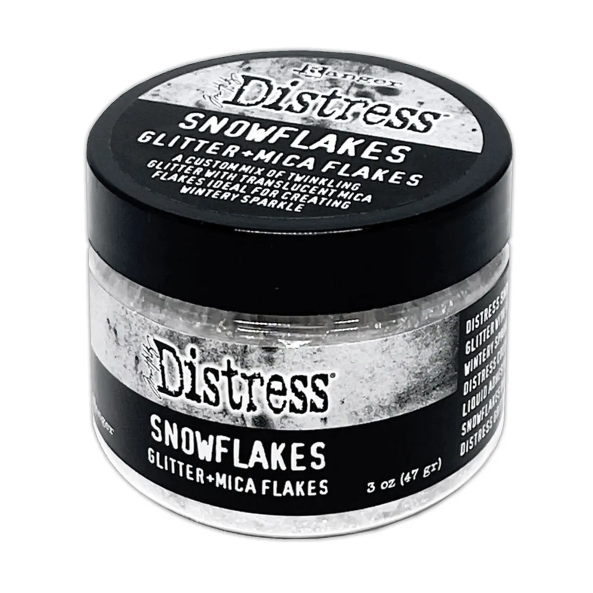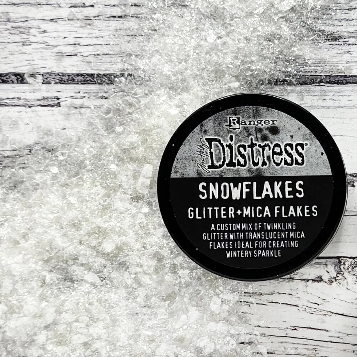 Die Tim Holtz Distress Snowflakes verbinden eine spezielle Mischung aus funkelndem Glitzer mit transparenten Glimmerflocken für einen nostalgischen, winterlichen Schimmer. Klebe die Snowflakes mit Distress Collage Medium, Ranger Glossy Accents oder anderen Flüssigklebern auf. Für noch mehr Dimension kannst du die Snowflakes auf feuchte Distress Texture Paste oder Distress Grit Paste streuen und trocknen lassen.