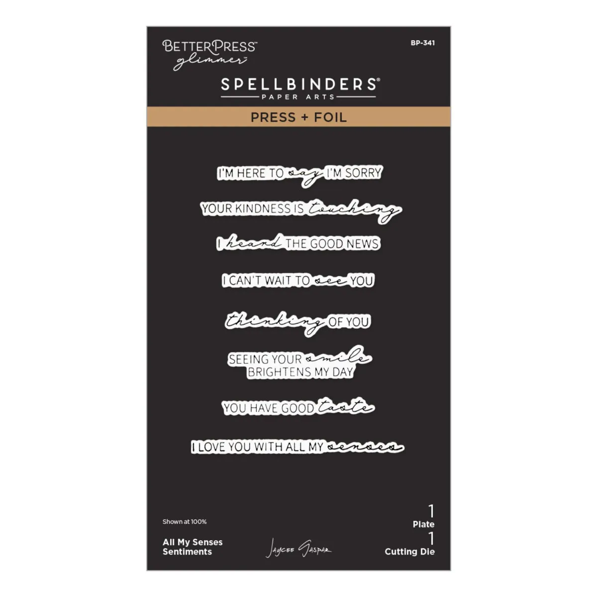Das All My Senses Sentiments Press + Foil Plate & Die Set ist Teil der All My Senses Collection von Jaycee Gaspar. Dieses Set aus einer Platte und einer dünnen Metall-Stanzform prägt acht Sentiments und schneidet jedes Sentiment auf einmal – ein Schritt, fertig! In einer Kombination aus halber Schreibschrift und Druckschrift: „I'm here to say I'm sorry“, „Your kindness is touching“, „I heard the good news“, „Seeing your smile brightens my day“, „I can't wait to see you“, „You have good taste“, „Thinking of You“ und „I love you with all my senses“.