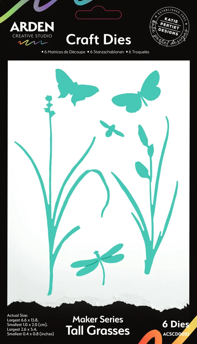 Verleihe deinen Bastelprojekten das gewisse Etwas mit dem „Maker Series Tall Grasses Craft Die Set“ von Arden Creative Studio. Dieses Set enthält sechs hochwertige Stanzschablonen mit filigranen Motiven von hohen Gräsern, Schmetterlingen, einer Libelle und einer kleinen Biene – perfekt, um deinen Kreationen einen Hauch Natur zu verleihen.
