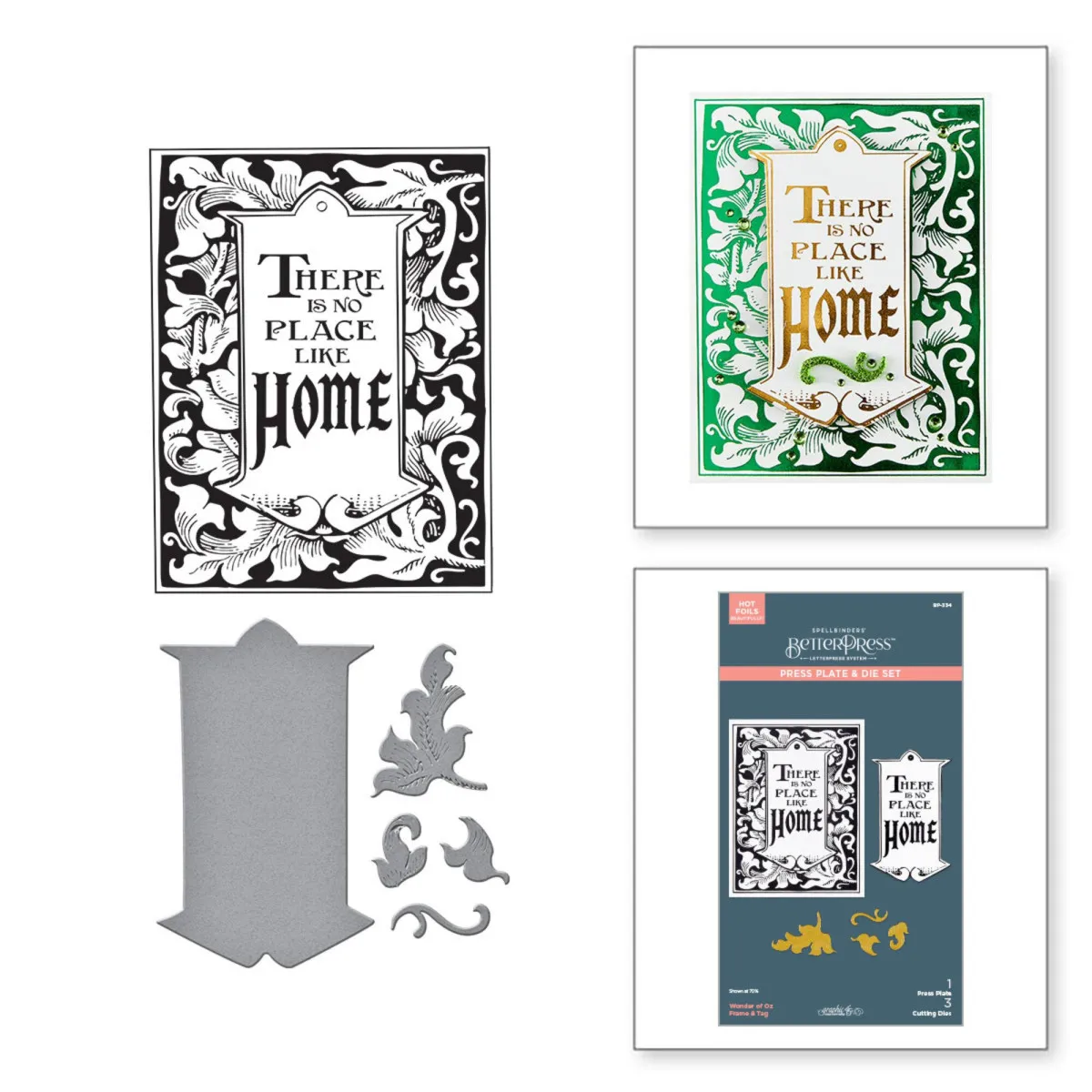 Das Wonder of Oz Frame & Tag BetterPress Plate & Die Set stammt aus der Wonder of Oz Kollektion von Graphic45. Die Platte prägt einen wunderschönen Rahmen mit einem Schriftzug in der Mitte. Der Schriftzug „There's No Place Like Home“ kann mit der passenden Tag-Stanzform ausgeschnitten werden. Die weiteren Stanzformen schneiden eine Weinrebe und drei verschiedene Blattmotive, die mit Schaumklebeband für mehr Dimension hervorgehoben werden können. Bestreiche die Platten mit der BetterPress-Tinte und presse sie gegen das BetterPress Baumwollkartenpanel und die Blätter für ein gestochen scharfes Letterpress-Design.