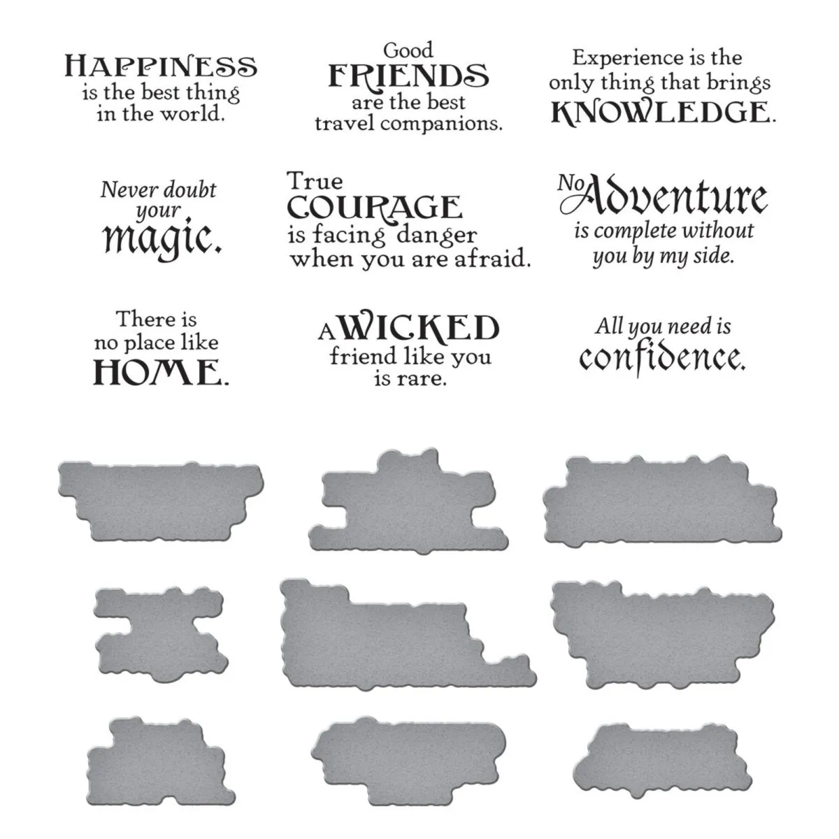 Das Wonder of Oz Sentiments BetterPress Plate & Die Set ist Teil der Wonder of Oz Collection von Graphic45. Du kannst neun Sprüche gleichzeitig prägen und anschließend mit der passenden dünnen Metallschneideschablone in einem einzigen Durchgang ausstanzen. Das spart eine Menge Zeit, und du hast immer viele fertige Sprüche auf Vorrat. Trage einfach die BetterPress Ink auf die Platten auf, um sie auf das BetterPress Cotton Card Panel und die entsprechenden Bögen zu pressen und ein klares Letterpress-Design zu erhalten.