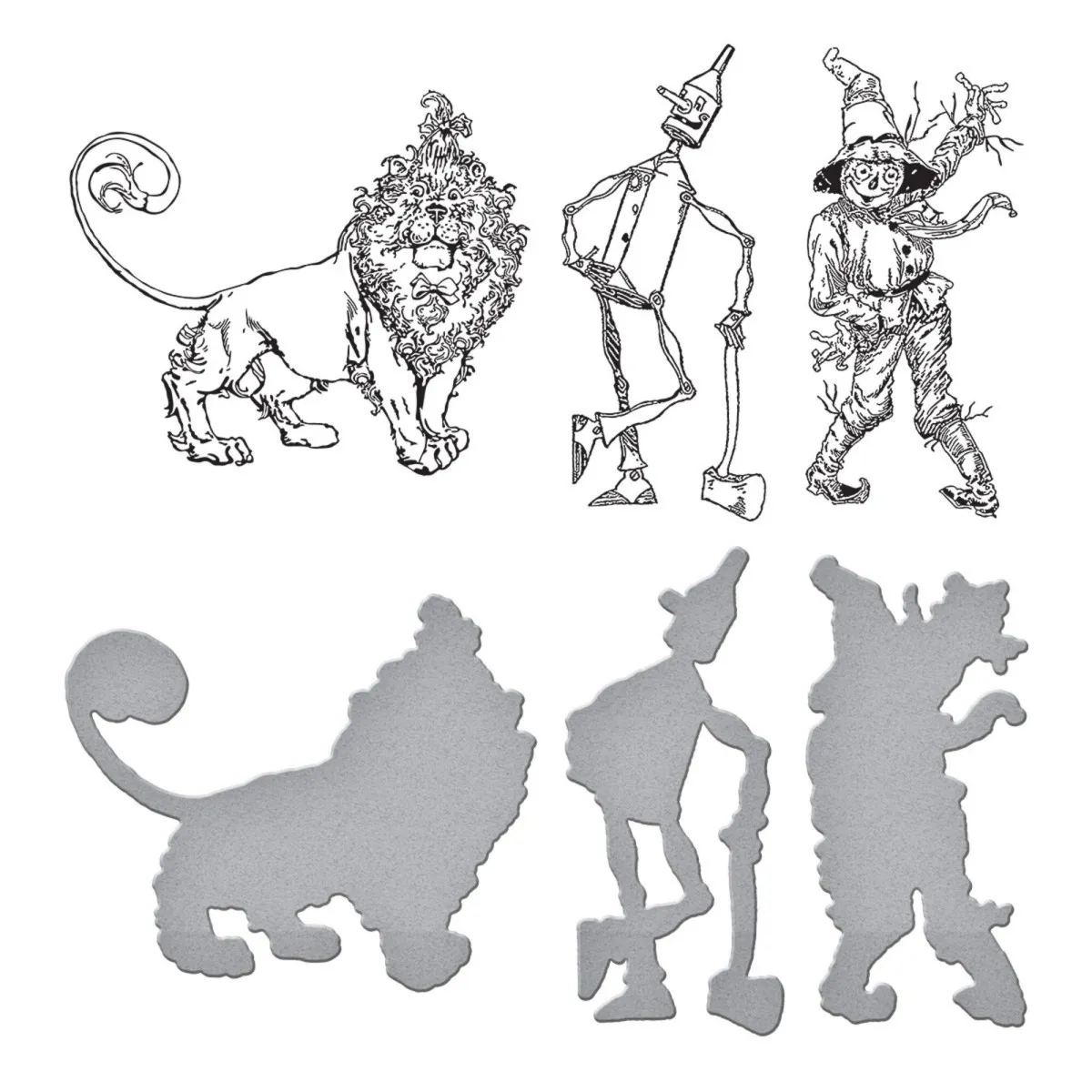 Das Tin Man, Scarecrow & Lion BetterPress Plate & Die Set ist Teil der Wonder of Oz Kollektion von Graphic45. Prägen kannst du damit Dorothys Freunde – den Blechmann, die Vogelscheuche und den Löwen – mit drei separaten Platten. Jede Figur hat ihre eigene dünne Metallstanzform, mit der du die Form ausschneiden und hervorheben kannst – nutze Schaumklebeband, um ihnen mehr Dimension zu verleihen! Bestreiche die Platten mit der BetterPress-Tinte und presse sie gegen das BetterPress Baumwollkartenpanel und die Blätter für ein gestochen scharfes Letterpress-Design.