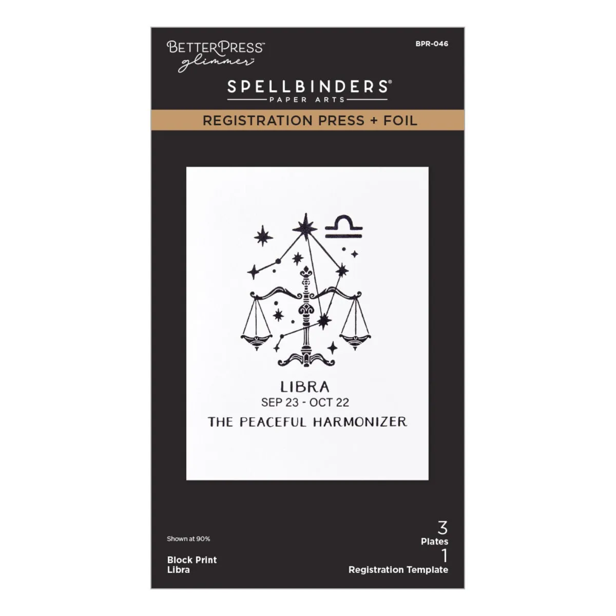 Die Block Print Libra Registrierpresse + Folienplatte ist Teil der Block Print Zodiacs Kollektion. Das Set aus drei Press- + Folienplatten und einer bedruckten Acetat-Registrierungsvorlage ermöglicht dir, einen mehrfarbigen Hintergrund und/oder die Platzierung von Motiven für das Sternzeichen Waage, seine Symbole, Daten und Eigenschaften zu gestalten. Beachte, dass die Acetatvorlage nur für das BetterPress System geeignet ist und nicht für das Glimmer Hot Foil System, da die Hitze das Acetat verformen würde. Das zusammengesetzte Waage-Design misst ca. 8,8 cm × 9,4 cm.