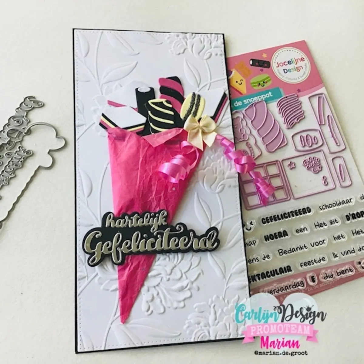 Dieses Stanzenset „In de Snoeppost“ von Jocelijne Design enthält passende Stempel sowie jede Menge leckere Süßigkeiten, Lakritz und Marshmallows. Perfekt geeignet für kleine Dankeschön-Geschenke für Lehrerinnen und Lehrer!