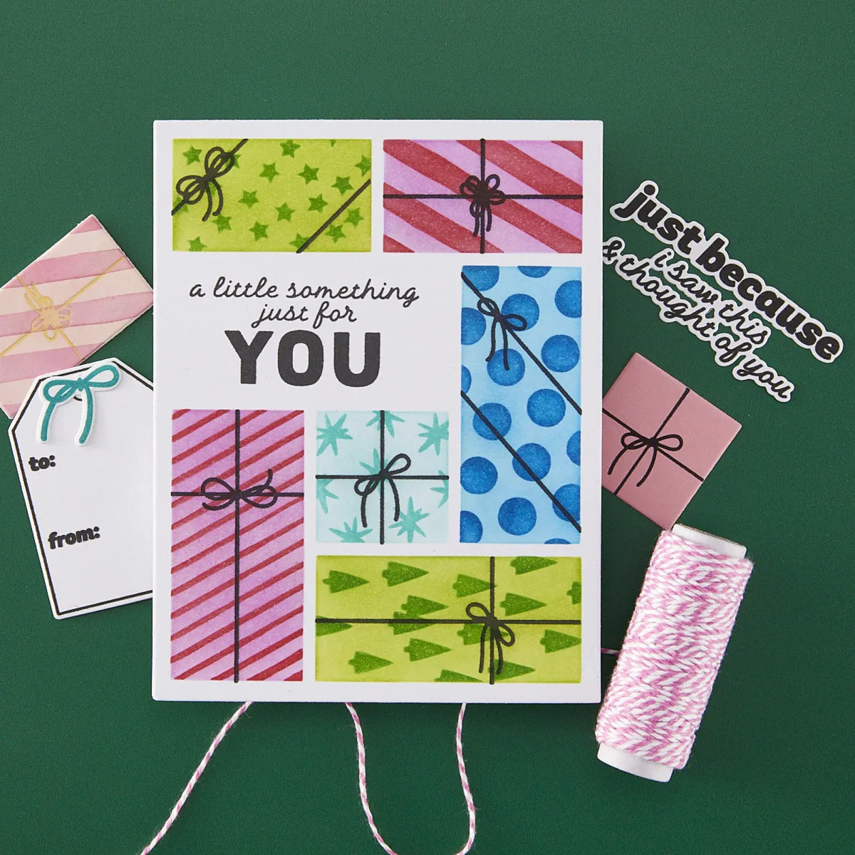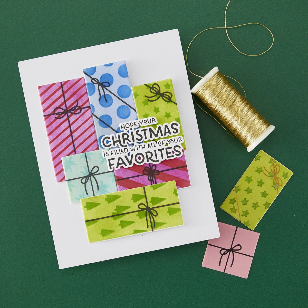 Sie wurden passend zum Gift Boxes Die Set entworfen. Dieses Set aus zwei Schicht-Schablonen fügt deinen Geschenken Farbe und verschiedene Muster wie Sterne, Streifen, Punkte und Tannen hinzu – perfekt, um individuelle „eingewickelte“ Designs zu erstellen.